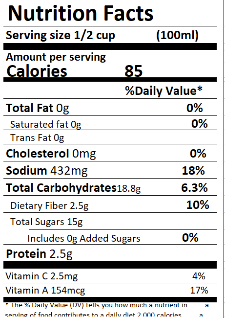 Tərkibi: Pomidor, duz Yağlar: 0 q Zülallar: 2.5 q Karbohidratlar: 18.8 q Şəkər: 15 q Enerji dəyəri: 357/85 kC/kkal